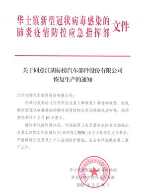 公司積極向江陰市政府申請復(fù)工,于正月十七接華士鎮(zhèn)新型冠狀病毒感染的肺炎疫情防控應(yīng)急指揮部文件通知, 公司正式啟動了生產(chǎn)計(jì)劃編排、關(guān)鍵設(shè)備物料拉動和員工召回等各項(xiàng)具體工作,在全面做好工作區(qū)域消毒和員工防護(hù)的前提下,緊急開展復(fù)工,保證產(chǎn)品準(zhǔn)時(shí)交付。
