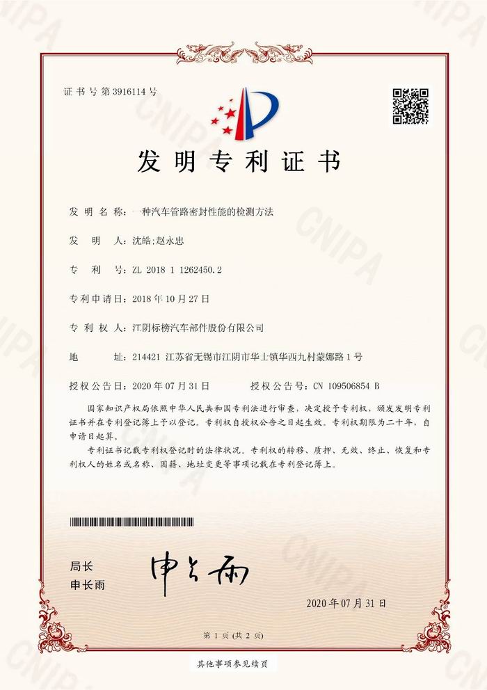 公司研發(fā)的“一種汽車管路密封性能的檢測方法”喜獲國家發(fā)明專利。